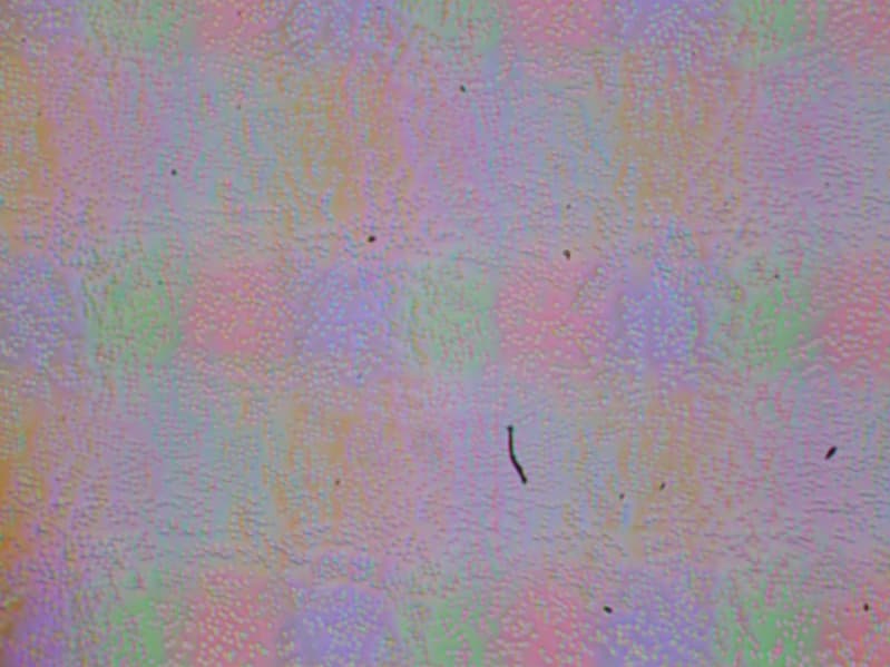 Зерно этих дефектов в несколько раз меньше размеров субпикселей (масштаб этих двух фотографий одинаковый), поэтому фокусировка на микродефектах и «перескок» фокуса по субпикселям при изменении угла зрения выражены слабо, из-за этого нет и «кристаллического» эффекта.