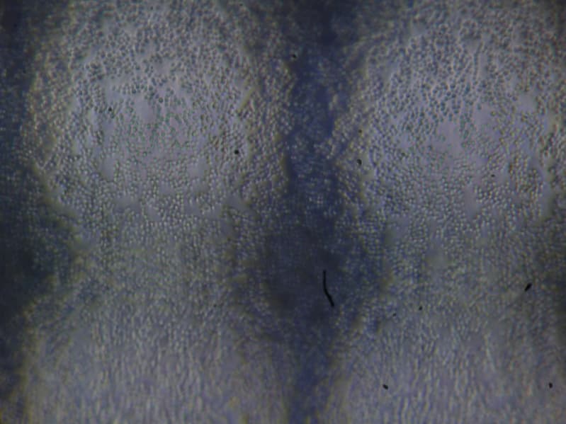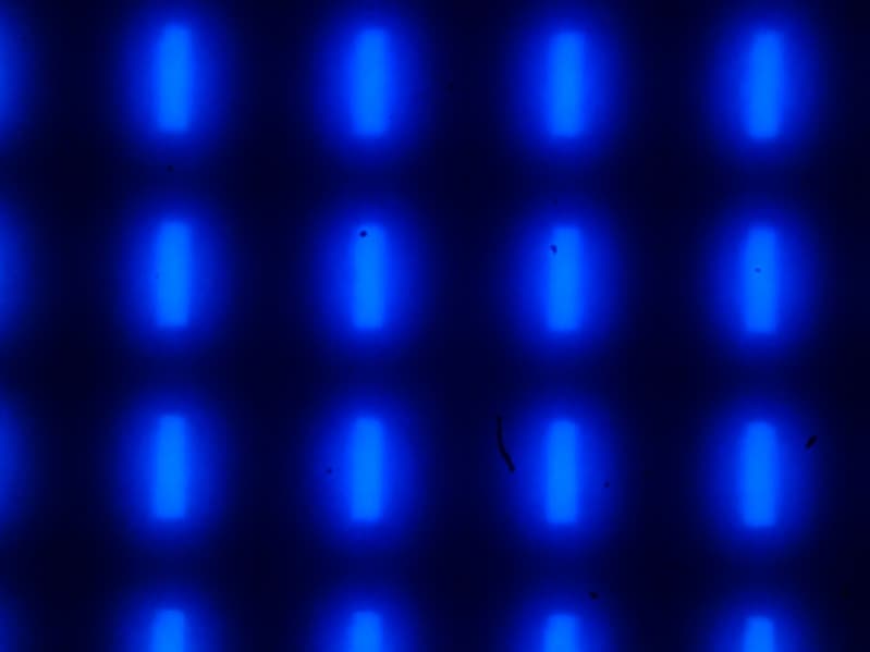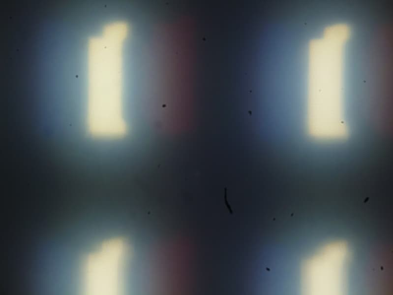 Фокусировка на поверхности экрана (фото справа выше) выявила хаотично расположенные микродефекты поверхности, отвечающие собственно за матовые свойства. Зерно этих дефектов в несколько раз меньше размеров субпикселей (масштаб этих двух фотографий одинаковый), поэтому фокусировка на микродефектах и «перескок» фокуса по субпикселям при изменении угла зрения выражены слабо, из-за этого нет и «кристаллического» эффекта.