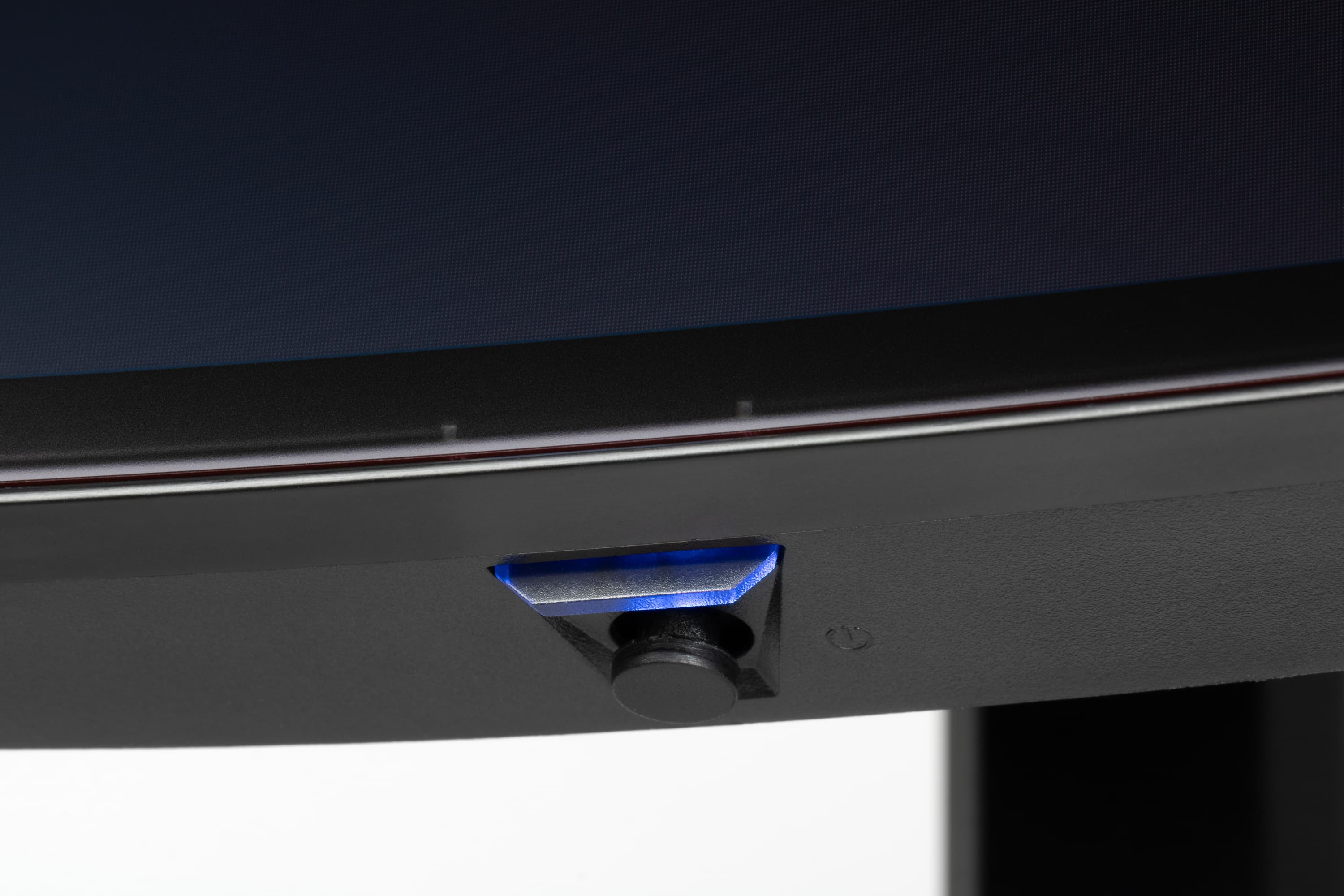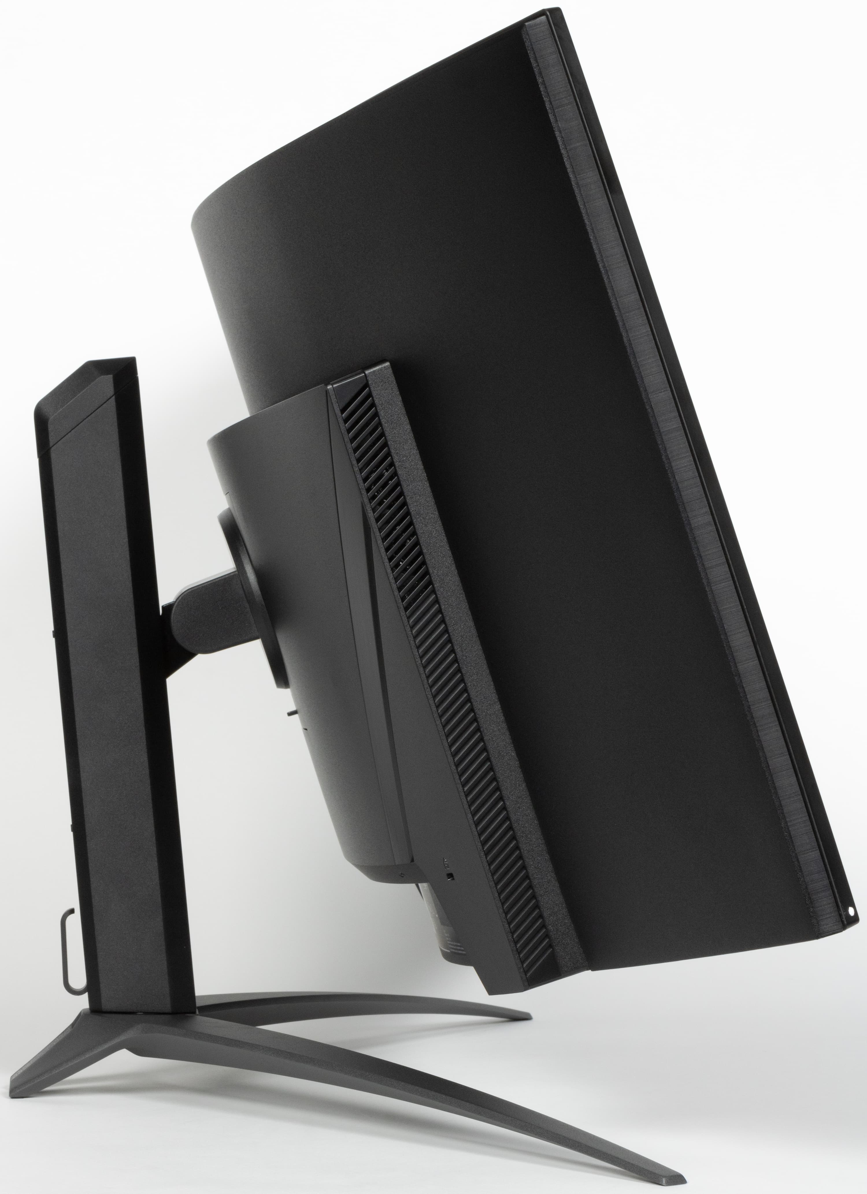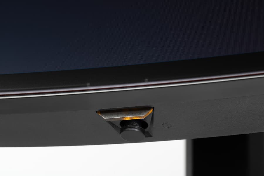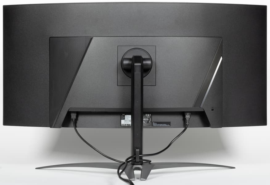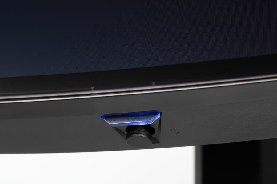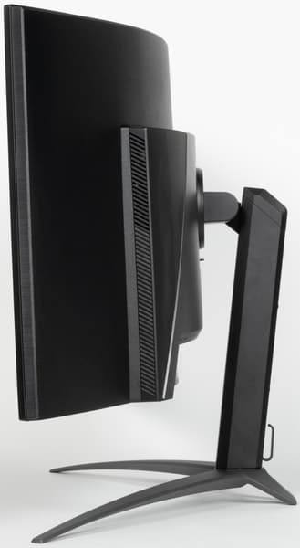 В целом дизайн умеренно игровой, поэтому с точки зрения внешнего вида монитор можно считать универсальным. Ориентацию на игроков выдают разве что дизайн подставки и логотип на ней. Панели монитора и кожухи стойки подставки изготовлены из черного пластика в основном с просто матовой поверхностью. Плоскость экрана изогнута по цилиндру (с заявленным радиусом кривизны 0,8 м) так, что правый и левый край выдвинуты вперед. По отражению в экране видно, что изгиб более-менее равномерный на большей площади, его радиус порядка паспортного. Внешняя поверхность матрицы черная, полуматовая, жесткая. Специального антибликового покрытия (фильтра) нет, но экран и не высветляется под внешним освещением, как это бывает у некоторых моделей с матрицами OLED. Экран выглядит как монолитная поверхность, ограниченная по периметру узкой окантовкой. Выведя изображение на экран, можно увидеть, что на самом деле между внешними границами экрана и собственно областью отображения есть неширокие поля — порядка 7 мм до внешних краев сверху и по бокам и 10 мм снизу. (Выводимое изображение чуть меньше всей области отображения, и периодически сдвигается в пределах этой области для снижения эффекта выгорания)
