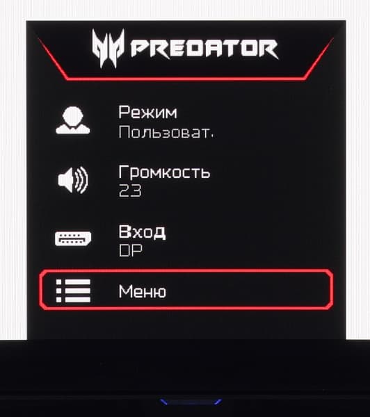 Индикатор питания при работе неярко светится синим, в режиме ожидания — оранжевым и не горит, если монитор условно выключен. Когда монитор включен и на экране нет меню, то при первом нажатии, или отклонении джойстика на экран выводится стартовое меню настроек.