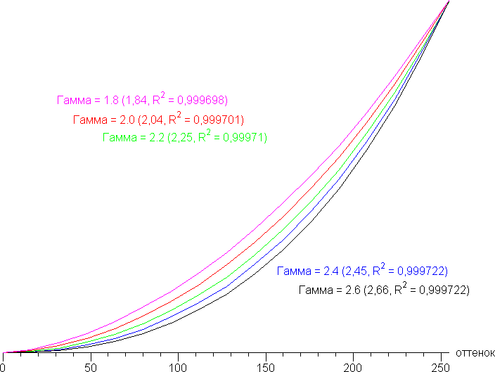 Реальная гамма-кривая зависит от выбранного профиля в списке Гамма (значения показателей аппроксимирующей функции приведены в скобках в подписях, там же — коэффициент детерминации):