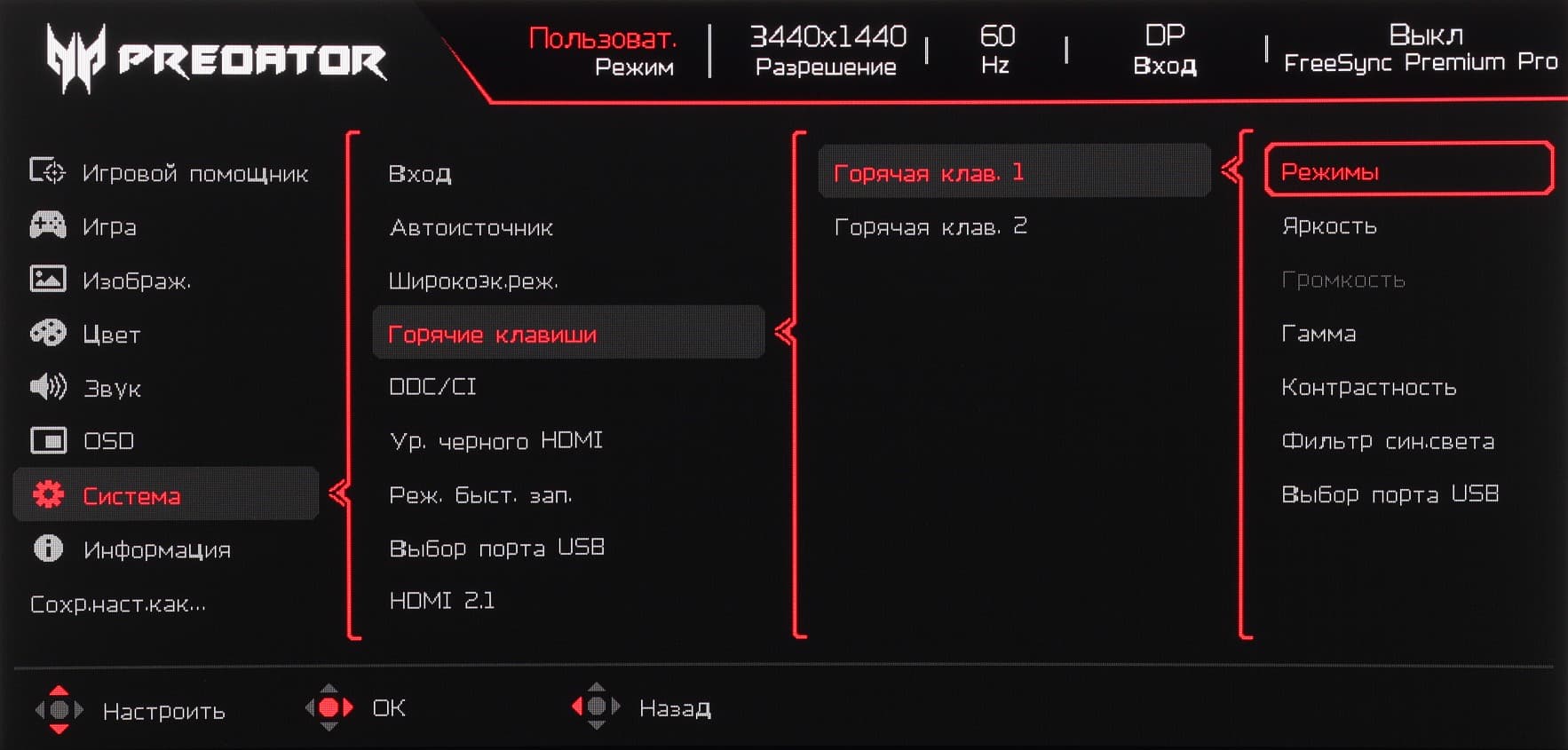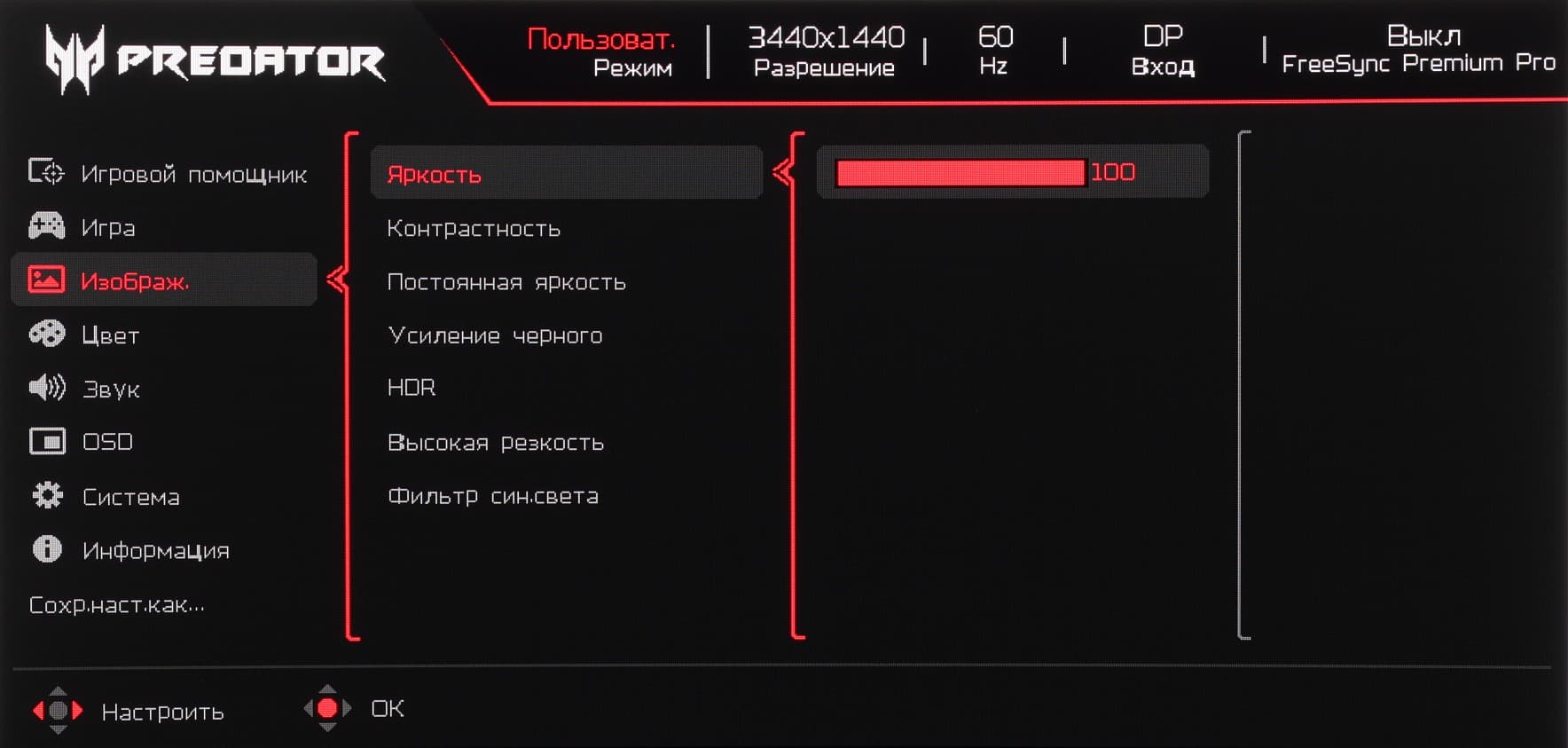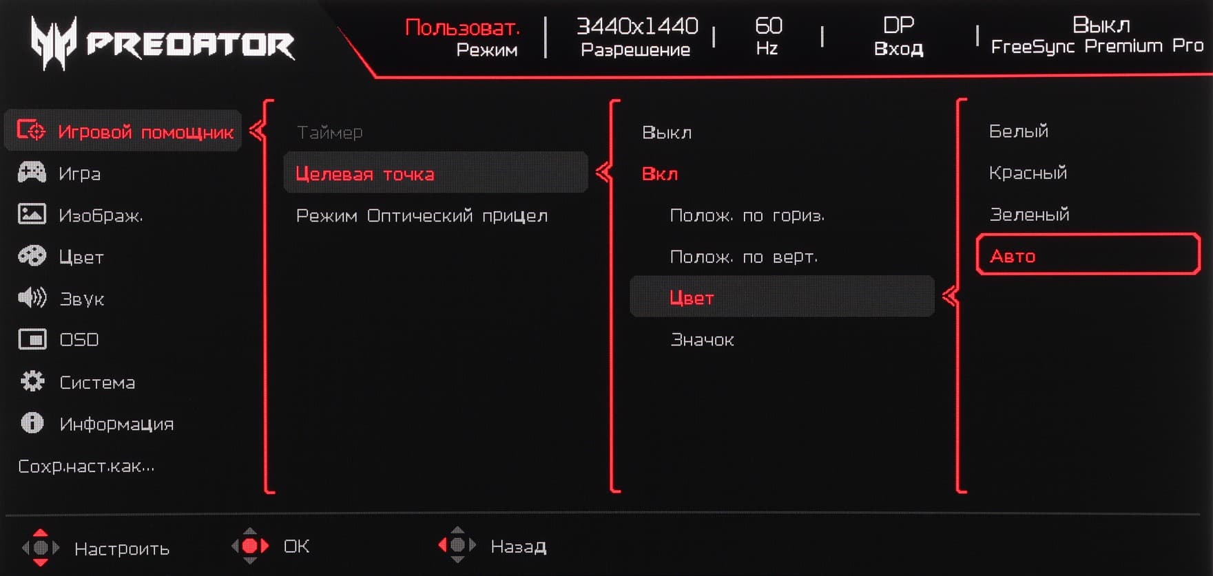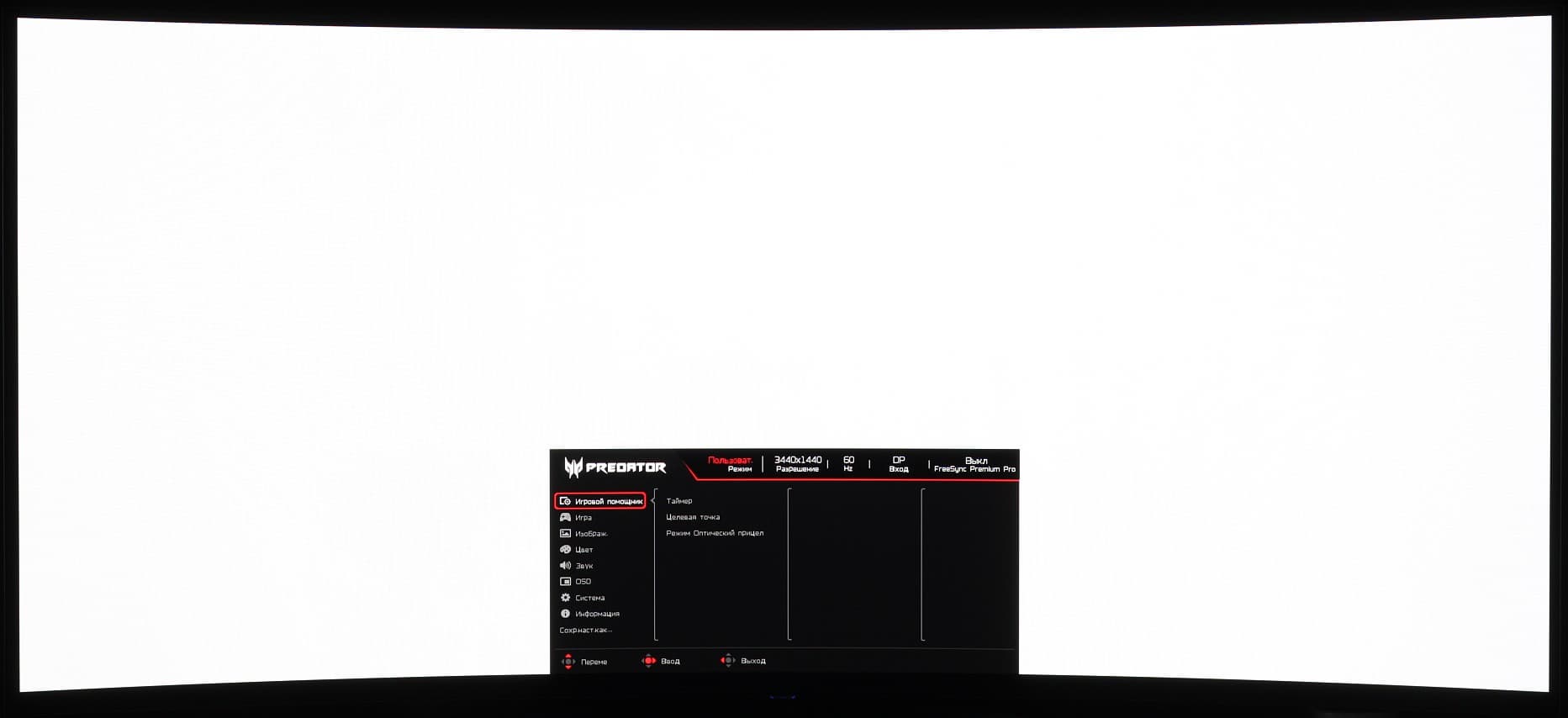 Третий — это выбор входа, а четвертый — вывод основного меню с настройками. Далее при навигации по меню в нижней его части есть подсказка по функциям джойстика. Меню достаточно крупное, надписи читаемые (белое поле — вся область отображения):