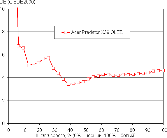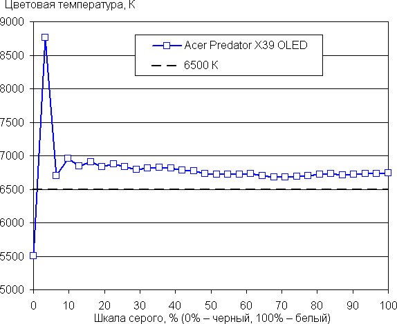 Самый близкий к черному диапазон можно не учитывать, так как в нем цветопередача не так важна, а погрешность измерения цветовых характеристик высокая. Цветовой баланс хороший, так как цветовая температура достаточно близка к стандартным 6500 К и отклонение от спектра абсолютно черного тела (ΔE) ниже 10 единиц, что для потребительского устройства считается приемлемым показателем. При этом оба параметра мало изменяются на различных участках шкалы серого, что улучшает визуальное восприятие цветового баланса.