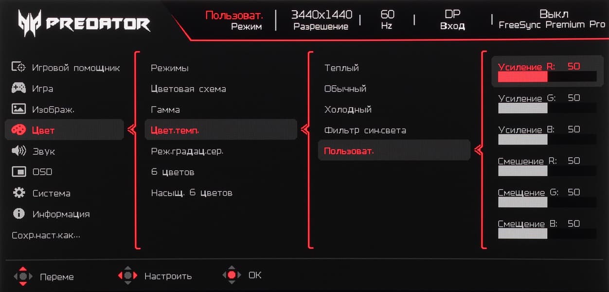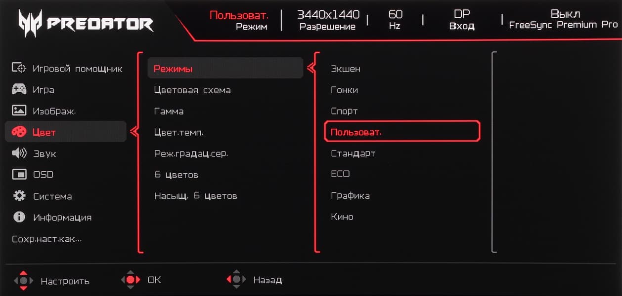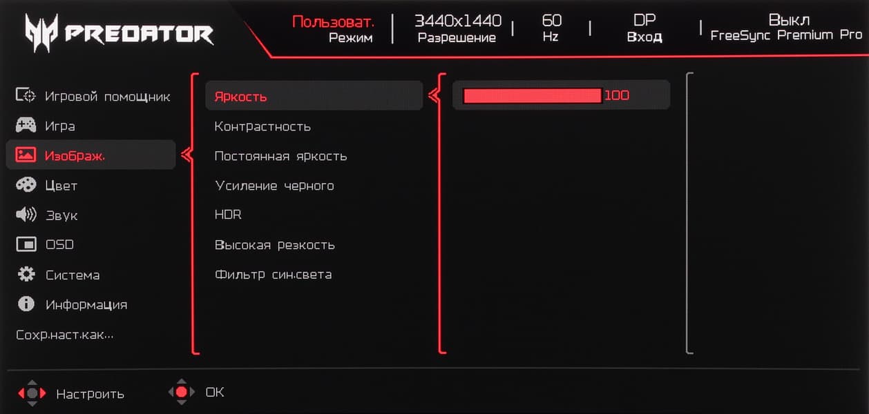 Навигация удобная, так как все делается только джойстиком, не нужно переносить палец на кнопки, к тому же списки зациклены. При настройке изображения меню остается на экране — это несколько мешает оценке вносимых изменений.