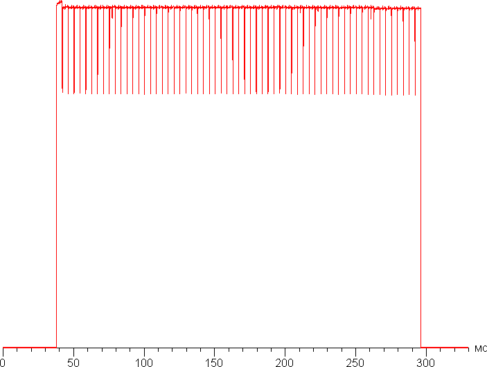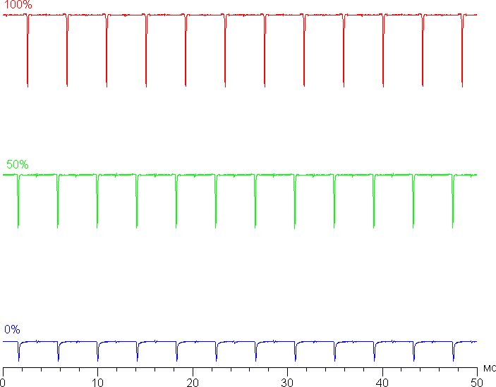 На любом уровне яркости видимое мерцание отсутствует, его не выявляет и тест на стробоскопический эффект. Регистрация зависимости яркости от времени при различных уровнях яркости выявила модуляцию яркости с очень высоким коэффициентом заполнения, что и объясняет отсутствие мерцания. В доказательство приведем графики зависимости яркости (вертикальная ось) от времени (горизонтальная ось) при различных значениях настройки Яркость в случае белого поля на 10% от площади экрана.
