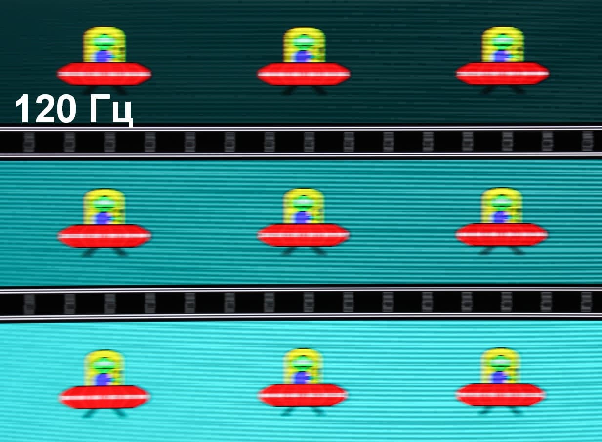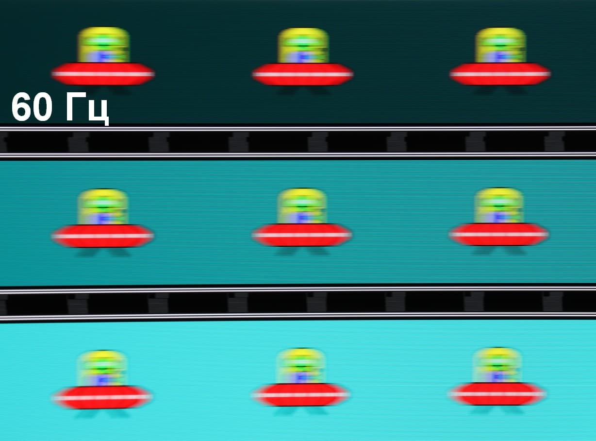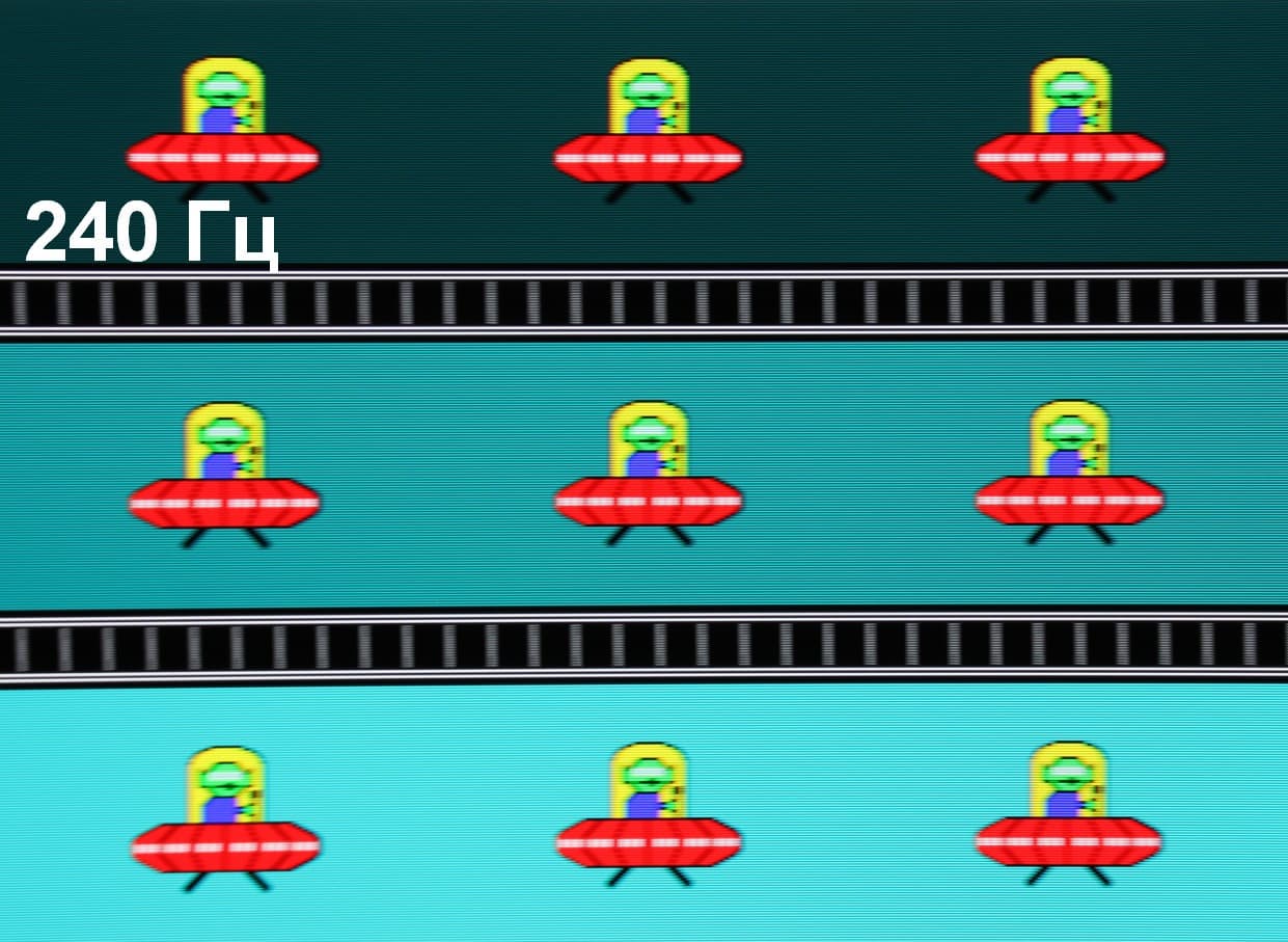 Для наглядного представления о том, что на практике означает такая скорость матрицы приведем серию снимков, полученных с помощью движущейся камеры. Такие снимки показывают, что видит человек, если он следит глазами за двигающимся на экране объектом. Описание теста приведено тут, страница с самим тестом тут. Использовались рекомендованные установки (скорость движения 960 пиксель/с для частот 60, 120 и 240 Гц, то есть на целое число пикселей за кадр), выдержка 1/15 с. На фотографиях указаны значения частоты обновления: