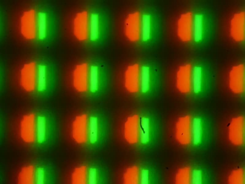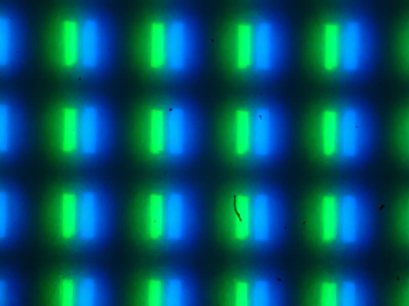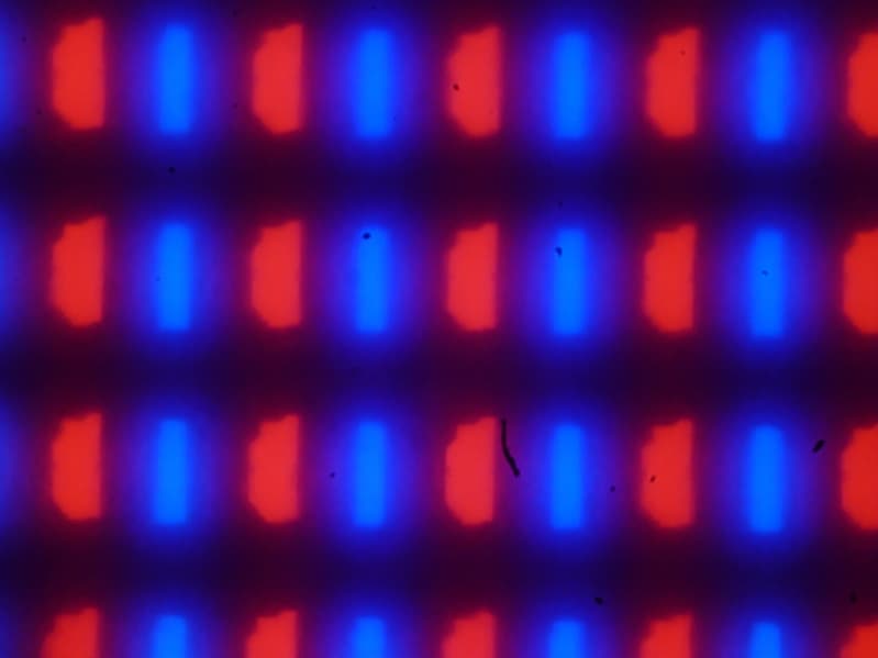 Видно, что светофильтры нанесены вертикальными полосками, как и в случае типичной ЖК-матрицы. При этом белый цвет в случае данного сочетания настроек формируется с участием красного субпикселя. Заметим, что из-за особенностей расположения субпикселей и формирования оттенков желтые объекты с четкими границами на белом фоне слева имеют выраженную красную кайму, а справа — зеленую. Также могут быть артефакты при отображении текста, если используется ClearType. Впрочем, ClearType можно отключить или использовать альтернативные технологии для отрисовки шрифтов. Обычный черный текст на белом фоне (или наоборот) без ClearType отображается без артефактов.