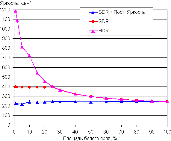 С изменением площади белого максимальная яркость может меняться, при этом характер зависимости яркости от площади белого участка зависит как минимум от текущего режима — SDR или HDR, — а также от того, включен ли режим Постоянная яркость. Например, в случае сигнала SDR и включенной опцией Постоянная яркость яркость от 1% до 100% площади белого сохраняется на уровне 220 — 240 кд/м². Если эту опцию выключить, то до 25% сохраняется яркость около 400 кд/м² и затем она снижается до 240 кд/м². А в режиме HDR яркость на 1% белого может достигать порядка 1200 кд/м²: