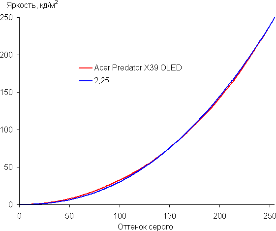 Аппроксимация полученной гамма-кривой дала показатель 2,25, что немного выше стандартного значения 2,2. При этом аппроксимирующая степенная функция слегка отклоняется от реальной гамма-кривой: