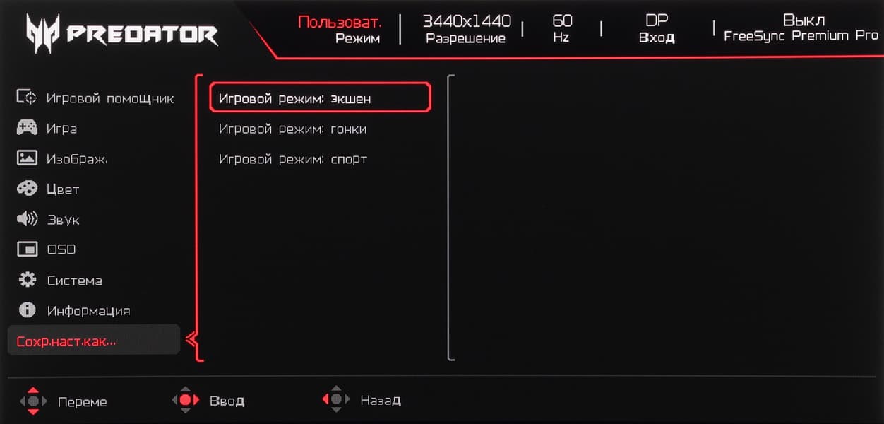 Есть четыре встроенных профиля и один пользовательский, в котором можно настраивать все, а три набора значений настроек можно сохранить в трех игровых профилях: