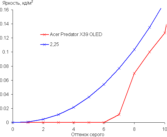 Рост прироста яркости на большей части шкалы серого более-менее равномерный, и каждый следующий оттенок значимо ярче предыдущего, за исключением шести самых темных оттенков, которые по яркости от черного не отличаются: