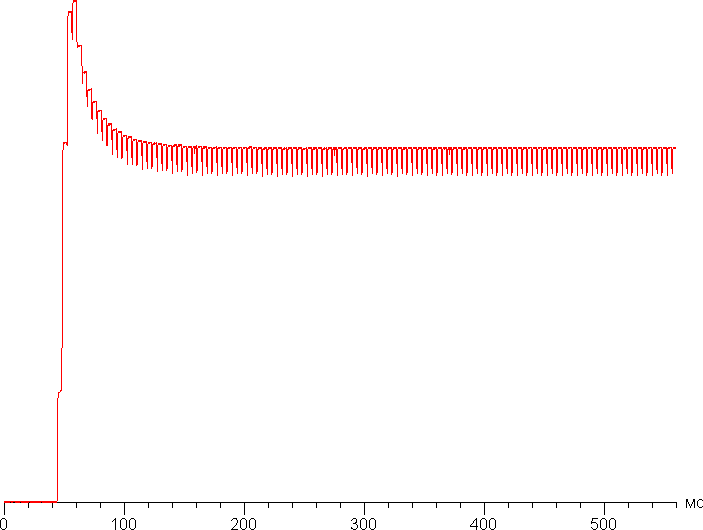 Время отклика очень мало, так как состояние пикселей меняется практически мгновенно. На фронтах переходов, как правило, нет выраженных ступенек, а значит, и артефакты в виде шлейфов, тянущихся за двигающимися объектами, исключены. Для примера приведем график изменения яркости (вертикальная ось) от времени (горизонтальная ось) в случае переходов между черным и белым и обратно: