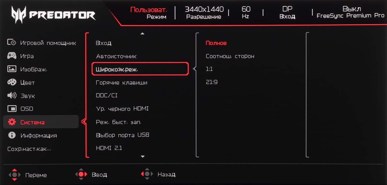 Режимов геометрической трансформации четыре: изображение растягивается на весь экран; увеличение до границ экрана с сохранением исходных пропорций, вывод один к одному по пикселям в центре экрана и точно с соотношением сторон 21:9. В тех случаях, когда изображение занимает не всю площадь экрана, оставшиеся поля заливаются черным.