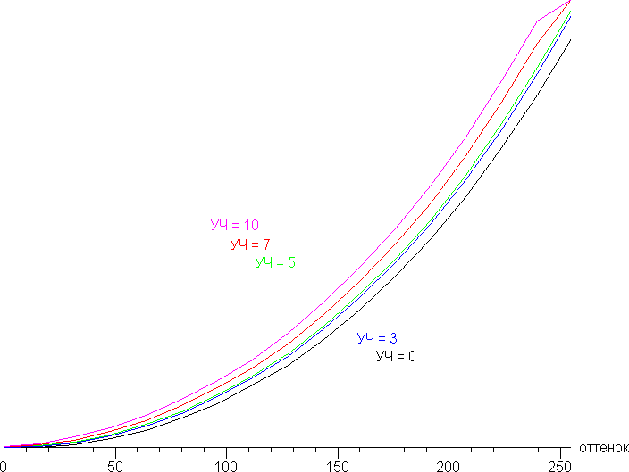 Дополнительной настройкой Усиление черного (от 0 до 10, по умолчанию 5, на графиках — УЧ) можно скорректировать гамма-кривую для улучшения/ухудшения различимости деталей в тенях: