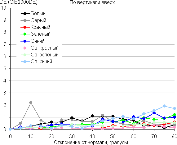 Для количественной характеристики изменения цветопередачи мы провели колориметрические измерения для белого, серого (127, 127, 127), красного, зеленого и синего, а также светло-красного, светло-зеленого и светло-синего полей во весь экран с использованием установки, подобной той, что применялась в предыдущем тесте. Измерения проводились в диапазоне углов от 0° (датчик направлен перпендикулярно к экрану) до 80° с шагом в 5°. Полученные значения интенсивностей были пересчитаны в отклонение ΔE относительно замера каждого поля при перпендикулярном положении датчика относительно экрана. Результаты представлены ниже: