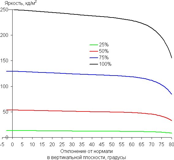 Снижение яркости на 50% от максимального значения не достигается даже при порядка 82 градусах отклонения. Для сравнения: в случае типичного ЖК-монитора на матрице VA яркость падает вдвое уже примерно при 35°.
