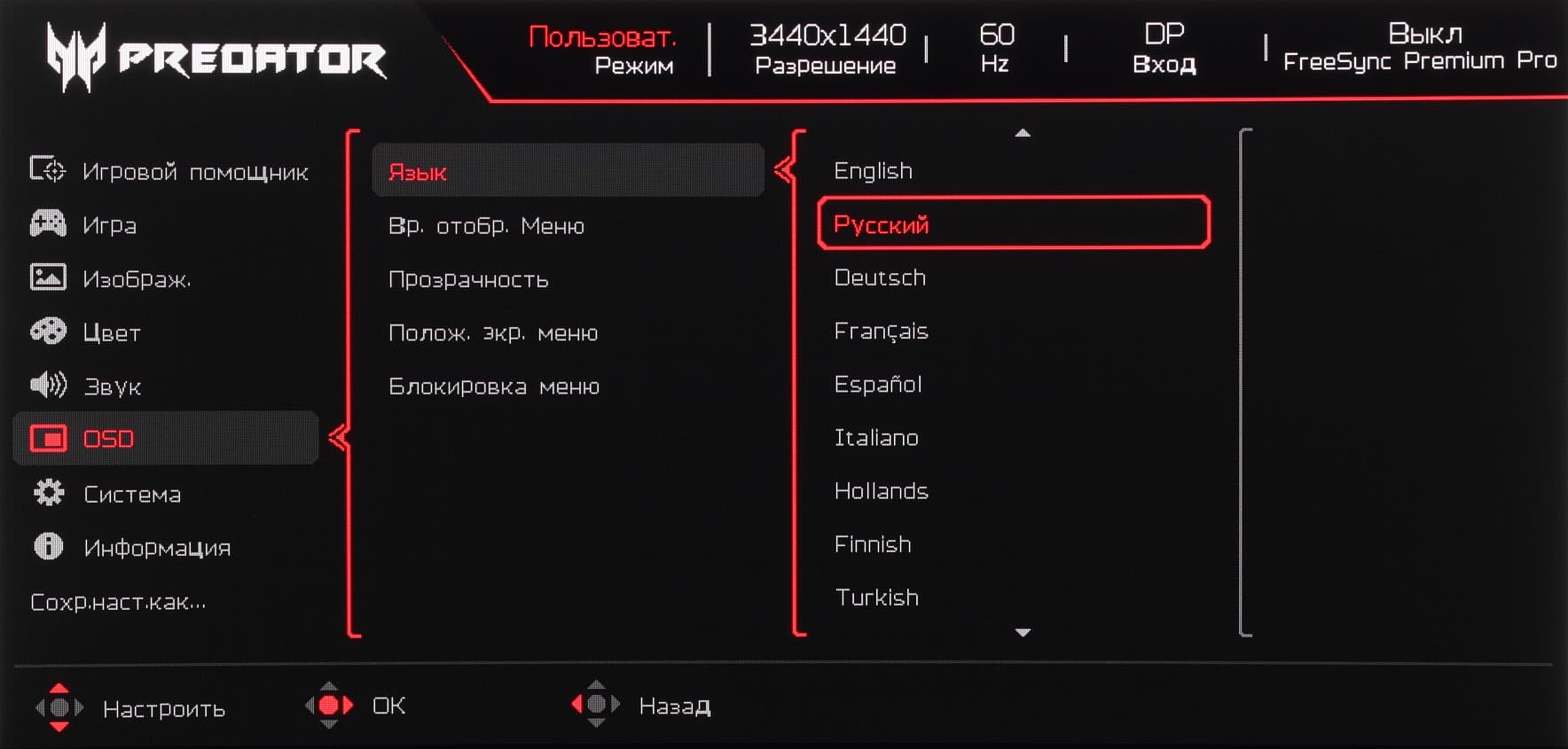 При необходимости можно установить уровень прозрачности фона, выбрать тайм-аут автоматического выхода из меню, переместить меню в одну из шести позиций и включить блокировку меню для предотвращения случайного изменения настроек. Есть русская версия экранного меню. Кириллический шрифт меню слегка неровный, но читаемый. Качество перевода на русский язык хорошее.