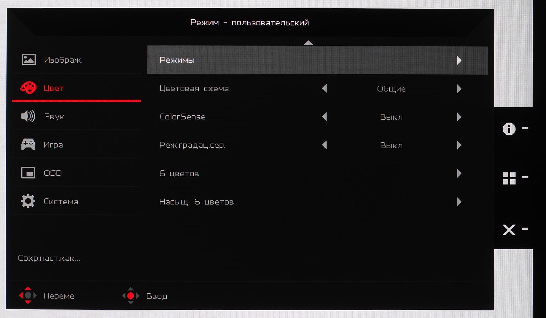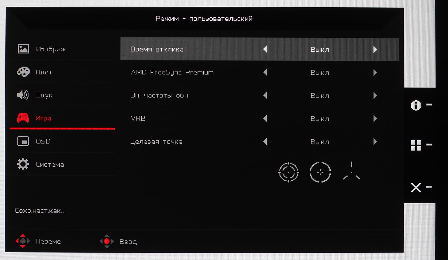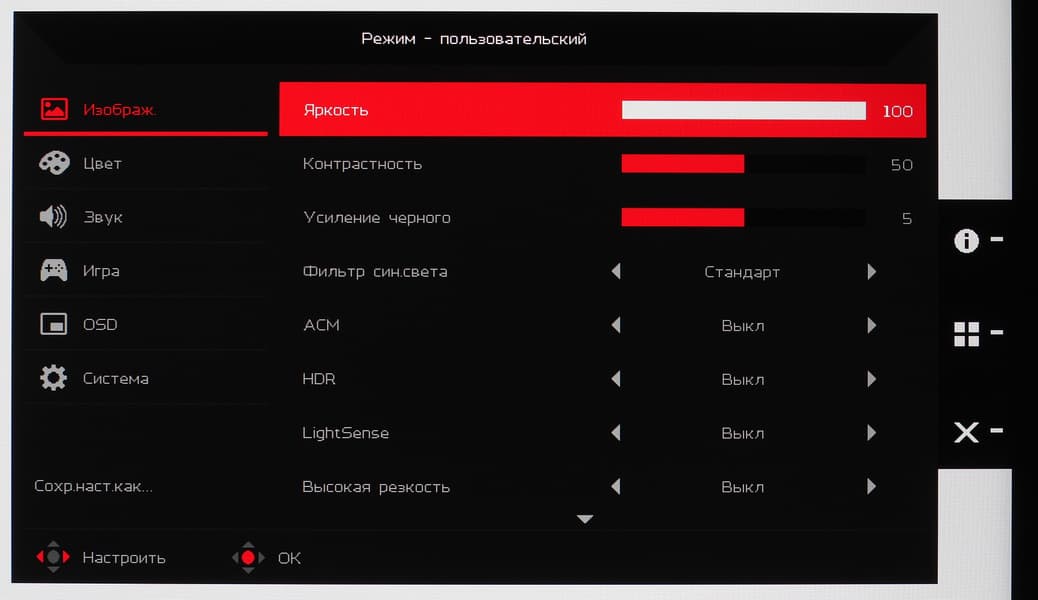 Их, как и несколько предустановленных, можно активировать в списке профилей. В профилях с скорректированным охватом многие настройки, в частности регулировки цветового баланса, недоступны. Можно включить автоматическую подстройку яркости или цветового баланса под внешние условия освещенности. Вообще такое количество настроек и функций, связанных с цветом, в случае игрового монитора смотрится несколько избыточным.