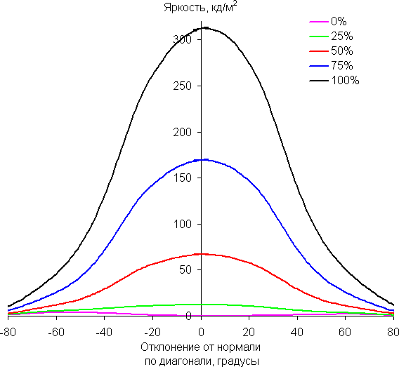 Чтобы выяснить, как меняется яркость экрана при отклонении от перпендикуляра к экрану, мы провели серию измерений яркости черного, белого и оттенков серого в центре экрана в широком диапазоне углов, отклоняя ось датчика в вертикальном, горизонтальном и диагональном (из угла в угол для формата 16:9) направлениях.