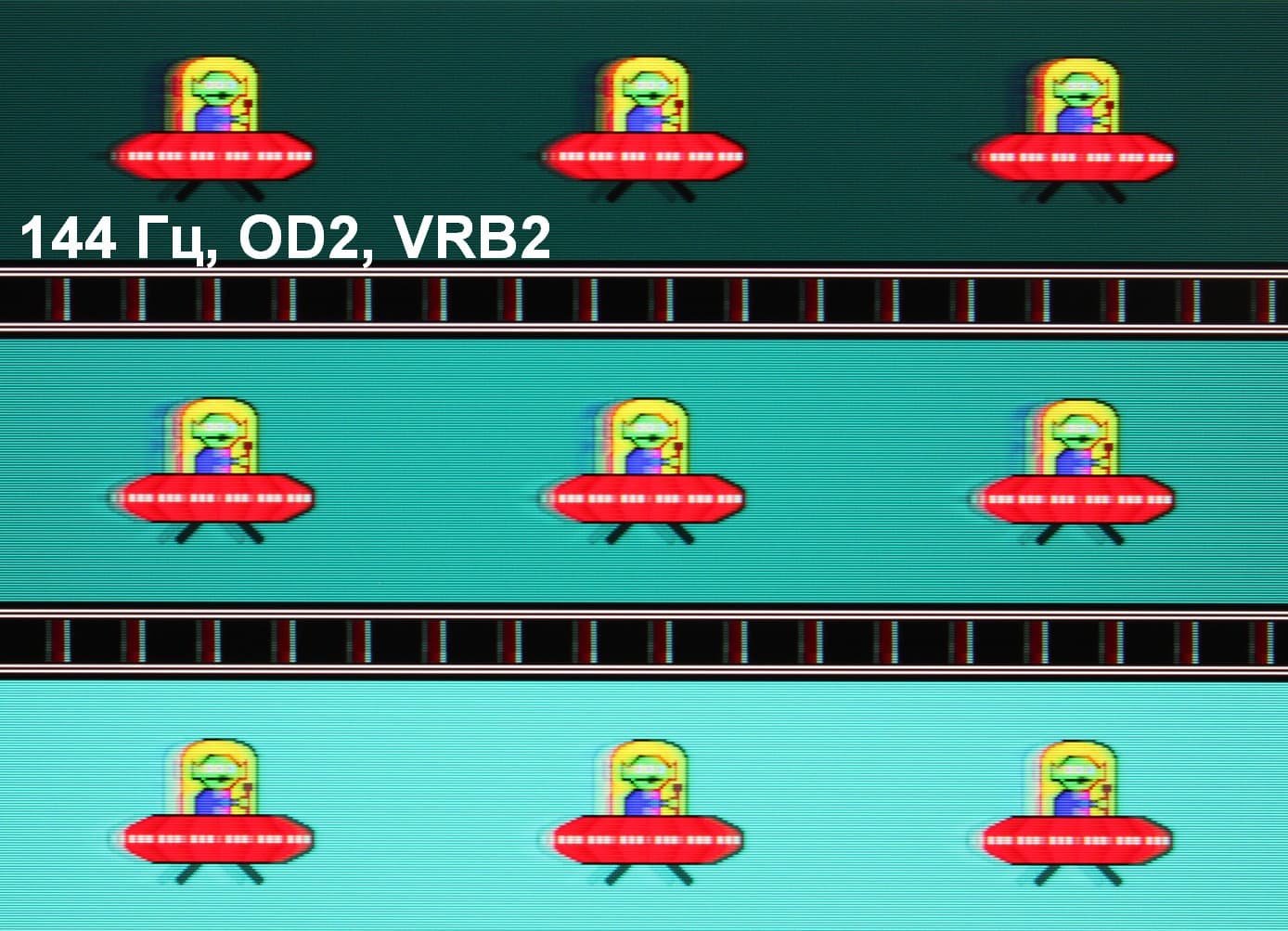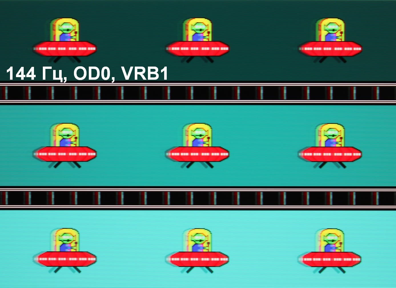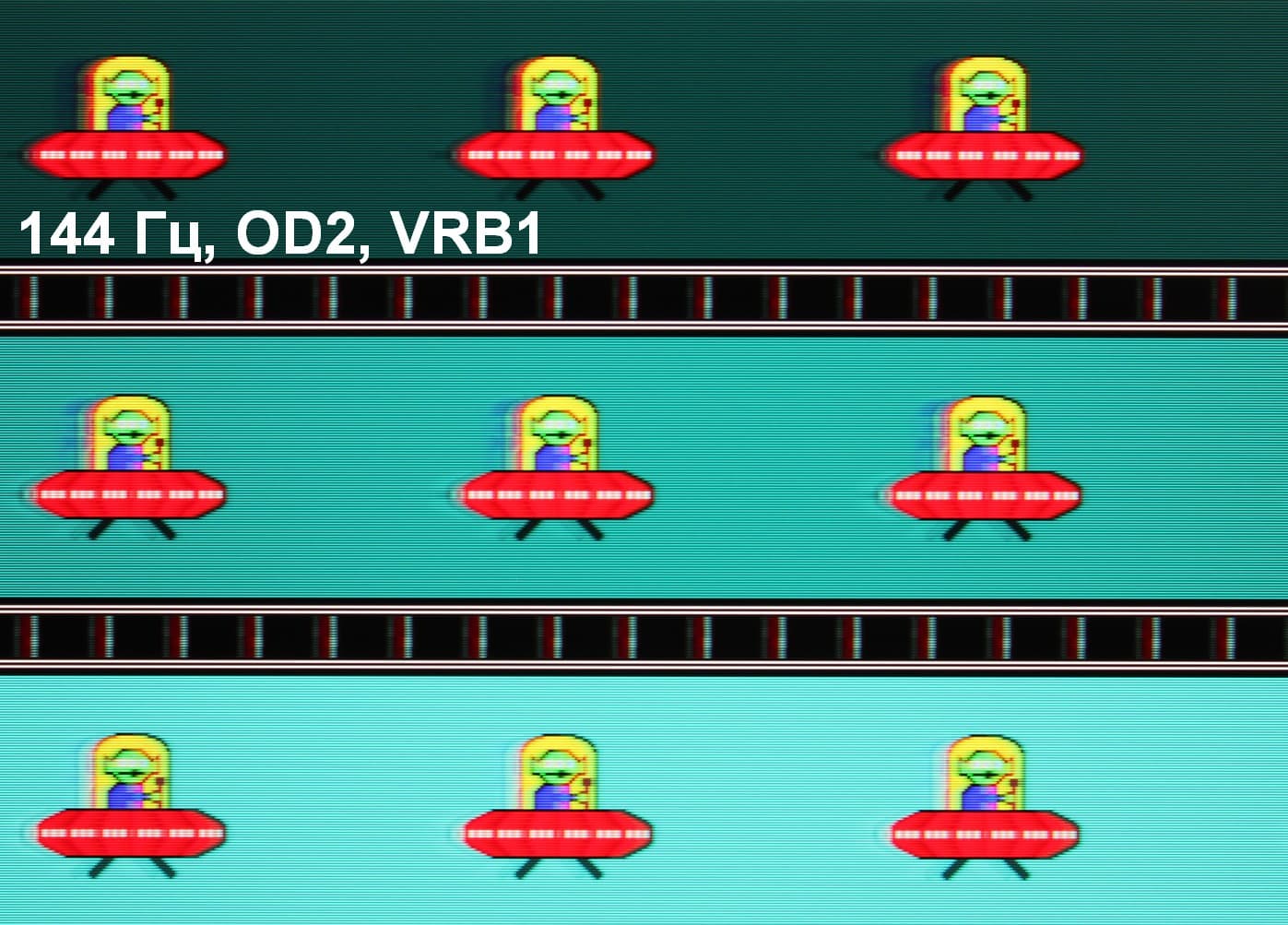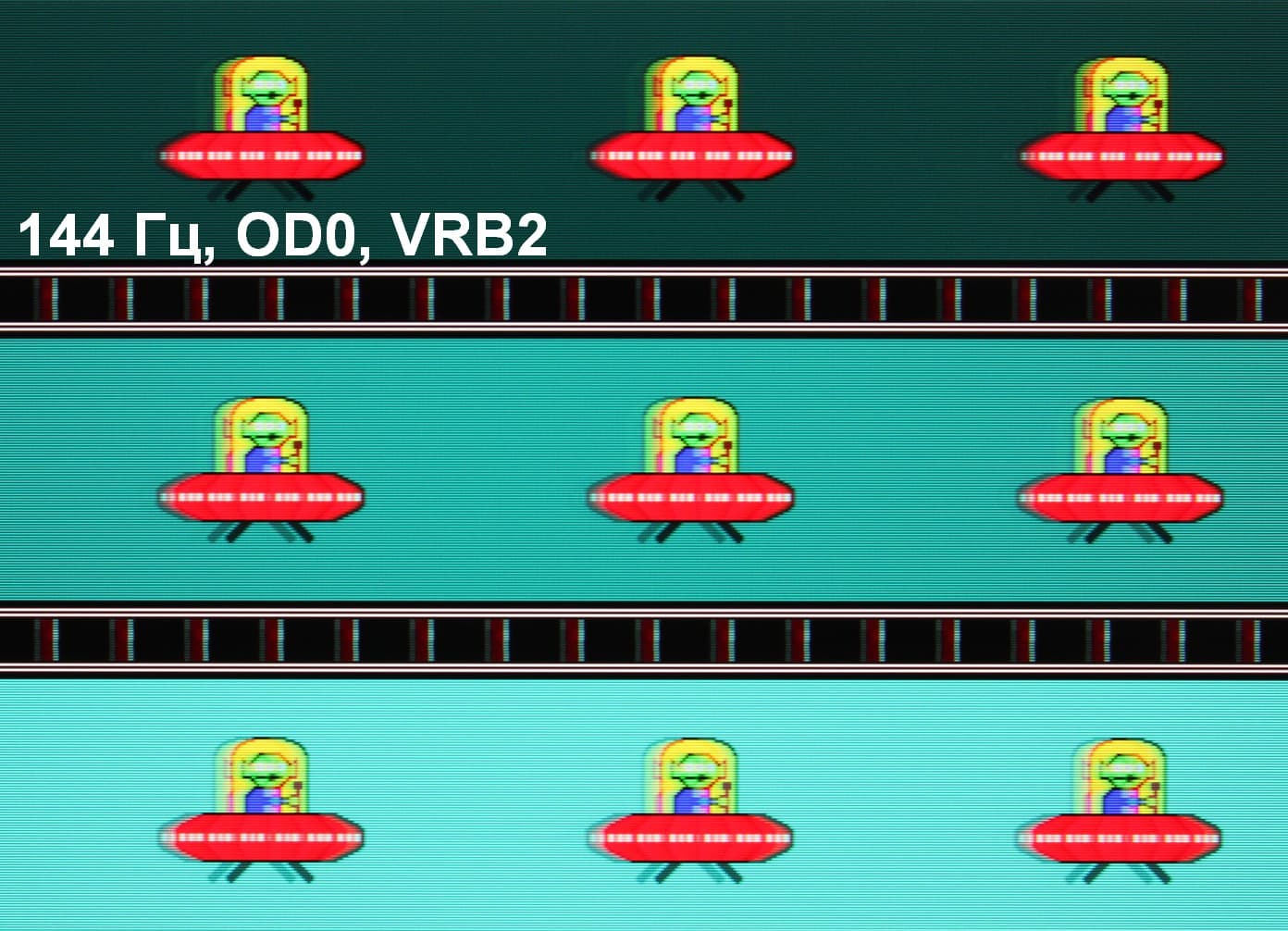 Для наглядного представления о том, что на практике означает такая скорость матрицы, какие могут быть артефакты от разгона и повышает ли четкость в движении, описанная выше настройка VRB, приведем серию снимков, полученных с помощью движущейся камеры. Такие снимки показывают, что видит человек, если он следит глазами за двигающимся на экране объектом. Описание теста приведено тут, страница с самим тестом тут. Использовались рекомендованные установки (скорость движения 960 пиксель/с для частот обновления 60 и 120 Гц, 1008 пиксель/с для часты обновления 144 Гц), выдержка 1/15 с, на фотографиях указаны значения частоты обновления, а также ступень разгона (ODx) и вставки черного кадра (VRBx).
