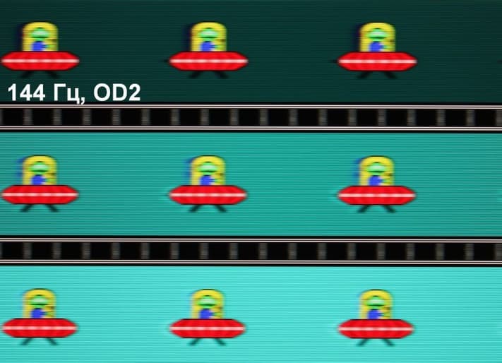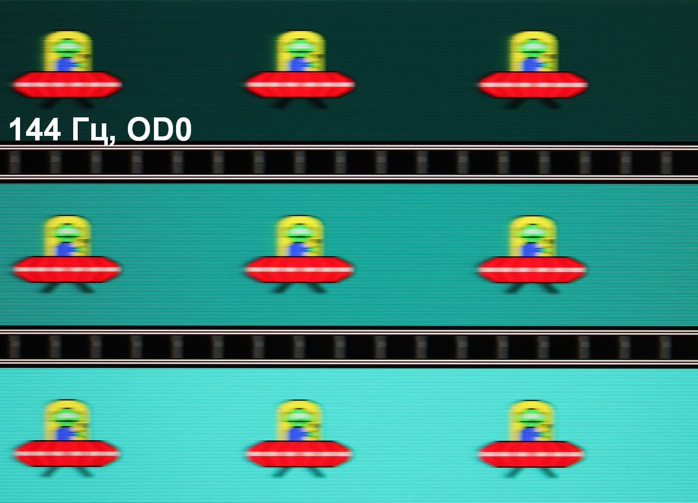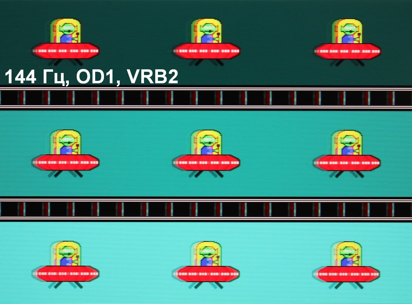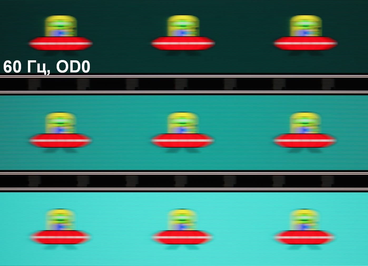 Для наглядного представления о том, что на практике означает такая скорость матрицы, какие могут быть артефакты от разгона и повышает ли четкость в движении, описанная выше настройка VRB, приведем серию снимков, полученных с помощью движущейся камеры. Такие снимки показывают, что видит человек, если он следит глазами за двигающимся на экране объектом. Описание теста приведено тут, страница с самим тестом тут. Использовались рекомендованные установки (скорость движения 960 пиксель/с для частот обновления 60 и 120 Гц, 1008 пиксель/с для часты обновления 144 Гц), выдержка 1/15 с, на фотографиях указаны значения частоты обновления, а также ступень разгона (ODx) и вставки черного кадра (VRBx).