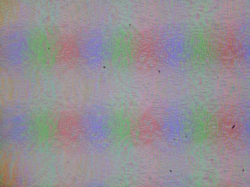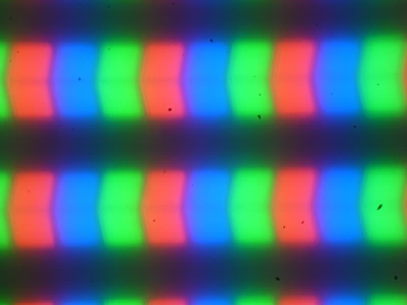 На микрофотографии ниже можно разглядеть типичную для IPS структуру в виде параллельных полосок, а также, что каждый субпиксель делится на два примерно равных домена (черные точки — это пыль на матрице фотоаппарата):