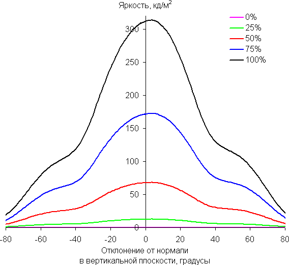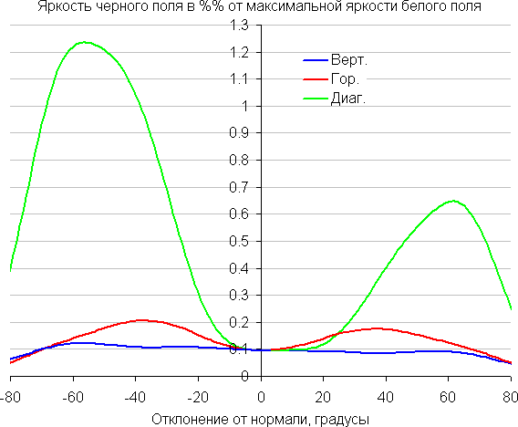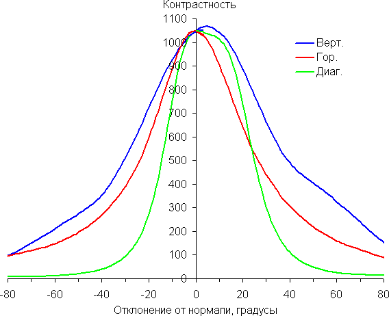 Углы обзора по снижению яркости относительно широкие. При отклонении в диагональном направлении яркость черного поля начинает резко возрастать уже при 20°-30° отклонения от перпендикуляра к экрану. Если сидеть не очень далеко от экрана, то черное поле по углам будет заметно светлее, чем в центре. Контрастность в диапазоне углов ±82° в случае отклонения по диагонали приближается к отметке 10:1, и опускается ниже при отклонении в одном направлении более чем на 65°.