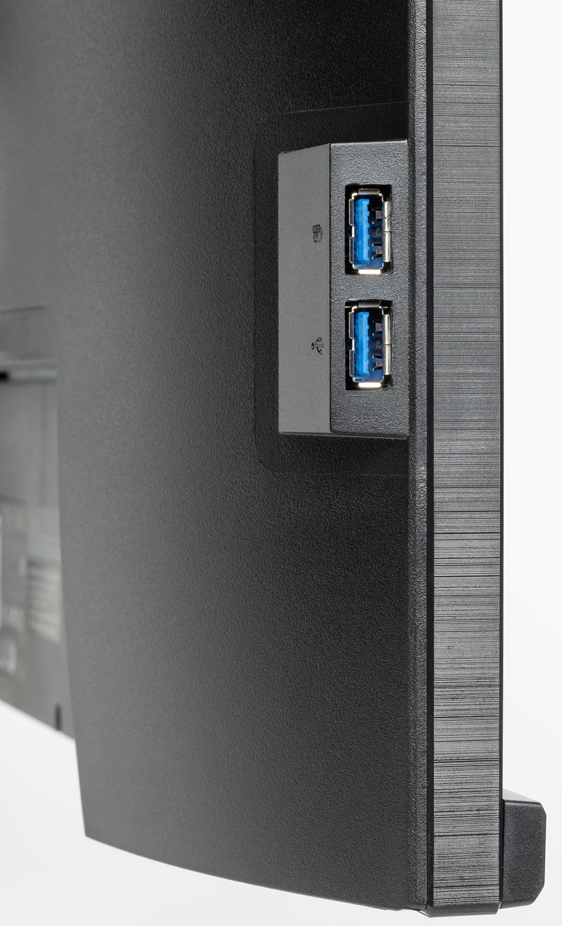 Разъем питания и все интерфейсные разъемы расположены в незамкнутой нише сзади и ориентированы вниз. Два из четырех выходных USB-портов концентратора вынесены на левый торец блока экрана, один из которых, судя по рельефному значку рядом с ним, имеет повышенную нагрузочную способность. Подключать кабели к монитору удобно только при перевороте блока экрана в портретную ориентацию. Также на задней панели можно обнаружить разъем для кенсингтонского замка.