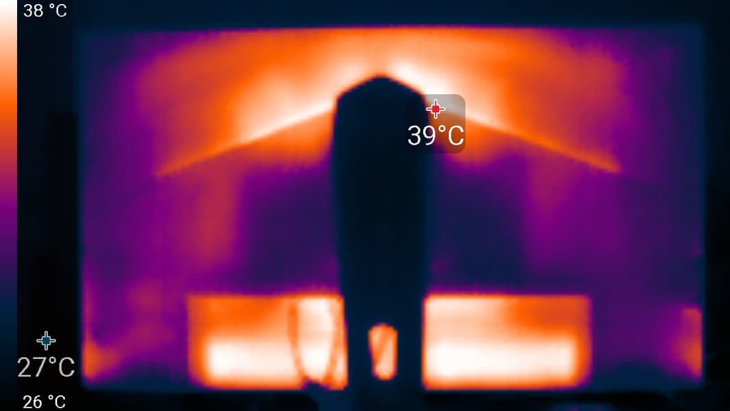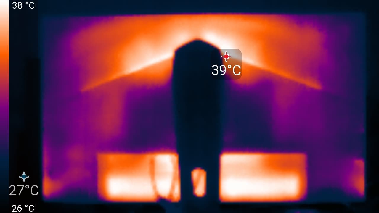 Нагрев монитора можно оценить по приведенным снимкам с ИК-камеры, полученным после долговременной работы монитора на максимальной яркости в режиме HDR (белое поле во весь экран) в помещении с температурой примерно 24 °C: