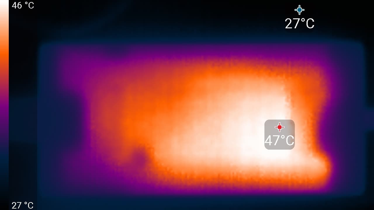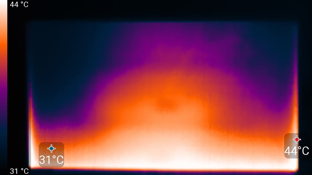 Нижний край экрана нагрелся до 44 °C максимум. Видимо, внизу находится светодиодная линейка подсветки экрана. Корпус БП нагрелся до 47 °C, что немало, но еще не критично: