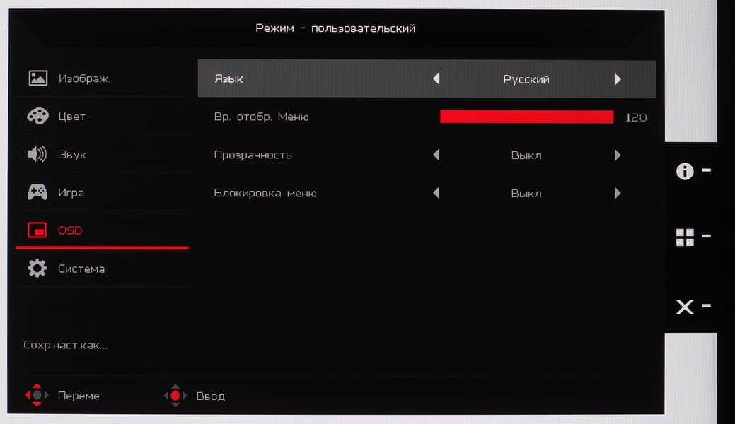 Навигация по меню удобная, так как почти все делается джойстиком, и только для выхода из меню нужно нажимать на кнопку, к тому же списки зациклены. При настройке изображения меню остается на экране — это несколько мешает оценке вносимых изменений. При необходимости можно установить уровень прозрачности фона, выбрать тайм-аут автоматического выхода из меню и включить блокировку меню для предотвращения случайного изменения настроек. Есть русская версия экранного меню. Кириллический шрифт меню ровный, надписи читаемые. Качество перевода на русский язык хорошее.