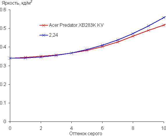 Рост прироста яркости весьма равномерный. При этом каждый следующий оттенок значимо ярче предыдущего, даже в темной области: