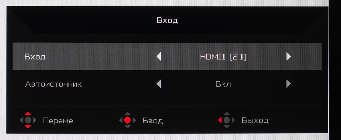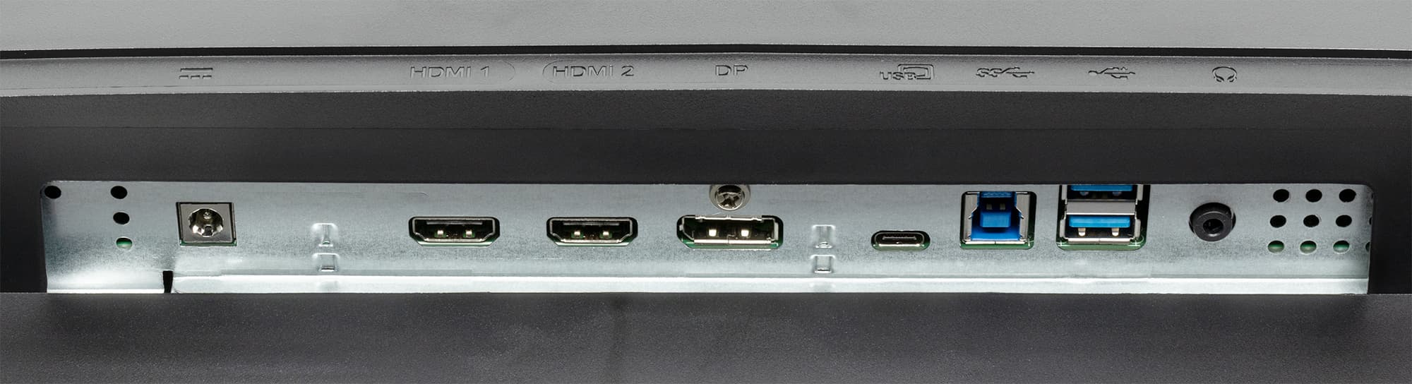 Представление об оснащенности интерфейсами дает таблица с характеристиками в начале статьи. Монитор имеет четыре цифровых входа, поддерживающих прием видеосигнала, — DisplayPort, пара HDMI и USB-C. Выбор входа осуществляется в основном меню установок или в меню быстрого доступа. Есть отключаемая функция автоматического поиска сигнала на входах. Цифровые аудиосигналы, передаваемые перечисленные выше входы, после преобразования в аналоговый вид выводятся на встроенные громкоговорители или на выход на наушники.