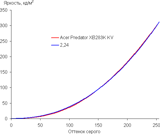 Аппроксимация полученной гамма-кривой дала показатель 2,24, что близко к стандартному значению 2,2, при этом реальная гамма-кривая мало отклоняется от аппроксимирующей степенной функции: