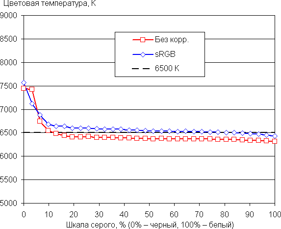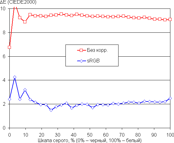 Графики ниже показывают цветовую температуру на различных участках шкалы серого и отклонение от спектра абсолютно черного тела (параметр ΔE) без вмешательства в самом ярком режиме (Без корр.) и после выбора профиля sRGB (sRGB):