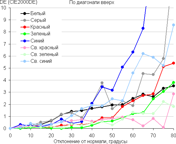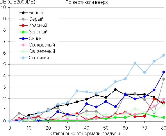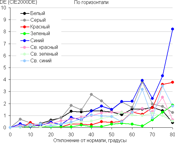Для количественной характеристики изменения цветопередачи мы провели колориметрические измерения для белого, серого (127, 127, 127), красного, зеленого и синего, а также светло-красного, светло-зеленого и светло-синего полей во весь экран с использованием установки, подобной той, что применялась в предыдущем тесте. Измерения проводились в диапазоне углов от 0° (датчик направлен перпендикулярно к экрану) до 80° с шагом в 5°. Полученные значения интенсивностей были пересчитаны в ΔE относительно замера каждого поля при перпендикулярном положении датчика относительно экрана. Результаты представлены ниже: