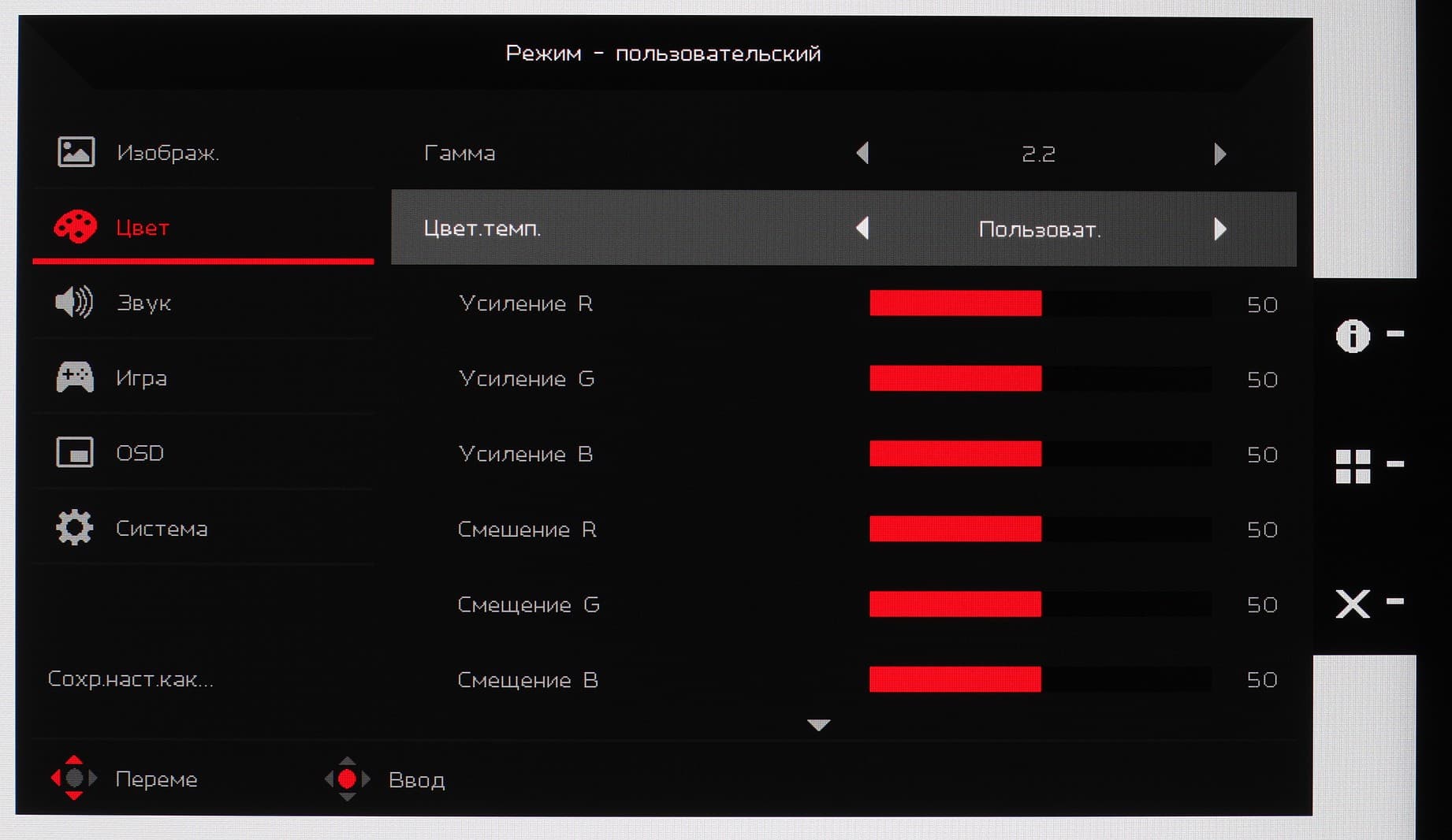 Настроек, изменяющих яркостный и цветовой баланс довольно много. Есть возможность как выбрать один из предустановленных профилей цветовой температуры, так и вручную отрегулировать усиление и смещение трех основных цветов.