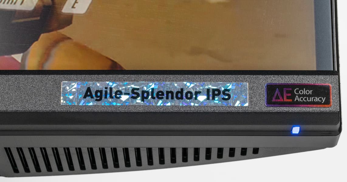 В целом дизайн умеренно игровой, поэтому с точки зрения внешнего вида монитор можно считать универсальным. Панели монитора и кожухи стойки подставки изготовлены из черного пластика в основном с просто матовой поверхностью, но местами есть мелкий рельефный узор под неполированный металл, только логотип на задней панели сформирован участками с зеркально-гладкой поверхностью. Внешняя поверхность матрицы черная, полуматовая, жесткая. Экран выглядит как монолитная поверхность, ограниченная снизу относительно узкой планкой, а сверху и по бокам — узкой окантовкой. Выведя изображение на экран, можно увидеть, что на самом деле между внешними границами экрана и собственно областью отображения есть неширокие поля — по 8 мм до внешних краев сверху и по бокам и примерно 1,5 мм до планки снизу.