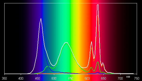 Можно предположить, что в светодиодах подсветки применяется синий излучатель и зеленый и красный люминофоры, при этом в красном люминофоре (а может и в зеленом) используются так называемые квантовые точки. Хорошее разделение компонент позволяет получить уширенный цветовой охват. В случае профиля sRGB с корректировкой цветового охвата компоненты подмешиваются друг к другу в значительной степени: