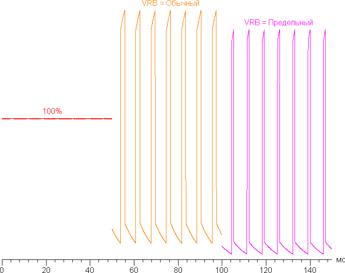 Есть режим со вставкой черного кадра (хотя на самом деле черным он в данном случае не является) с названием VRB. Зависимости яркости (вертикальная ось) от времени (горизонтальная ось) для двух значений соответствующего параметра: