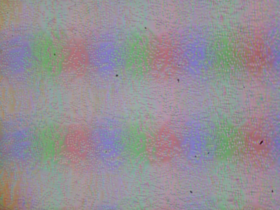 Зерно этих дефектов в несколько раз меньше размеров субпикселей (масштаб этих двух фотографий одинаковый), поэтому фокусировка на микродефектах и «перескок» фокуса по субпикселям при изменении угла зрения выражены слабо, из-за этого нет и «кристаллического» эффекта.