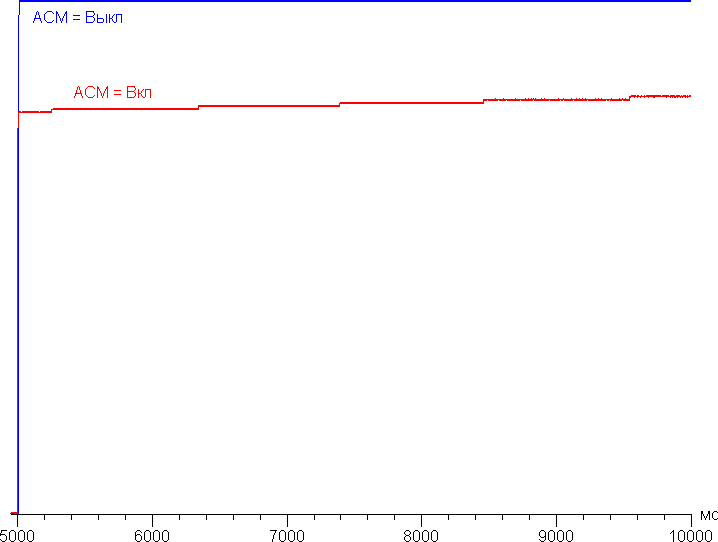 При включении режима с динамическим управлением яркости установившаяся контрастность формально возрастает, но не до бесконечности, так как даже на черном поле во весь экран подсветка совсем не выключается. График ниже показывает, как увеличивается яркость (вертикальная ось) при переключении с черного поля (после пяти секунд вывода) на белое при выключенной и включенной динамической подстройке яркости: