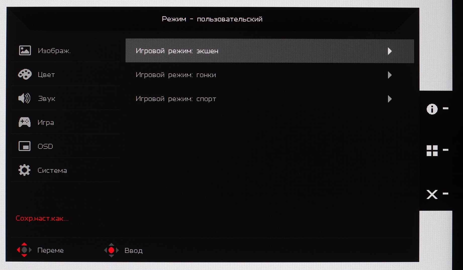 Последний значок стартового меню — вызов основного меню. Далее при навигации по меню напротив кнопок выводятся значки-подсказки — вывод информационного окна, выбор профиля и выход из меню. А в нижней части меню есть подсказка по функциям джойстика.