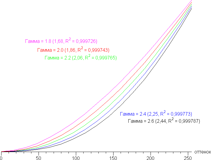 Реальная гамма-кривая зависит от выбранного значения в списке Гамма (значения показателей аппроксимирующей функции приведены в скобках в подписях, там же — коэффициент детерминации):