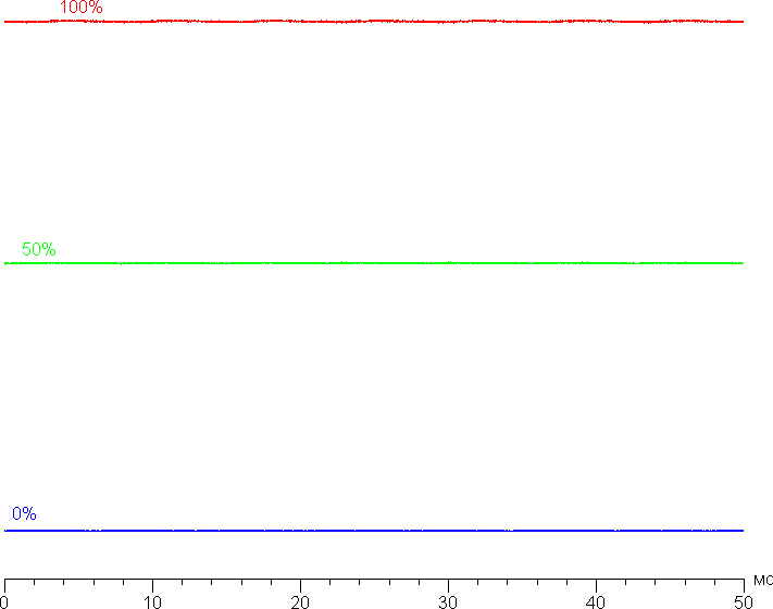 Яркость монитора меняется именно яркостью подсветки, то есть без ущерба для качества изображения (сохраняется контрастность и количество различимых градаций) яркость монитора можно менять в очень широких пределах, что позволяет с комфортом работать и смотреть фильмы как в освещенном, так и в темном помещении. На любом уровне яркости модуляция подсветки отсутствует, что исключает видимое мерцание экрана. В доказательство приведем графики зависимости яркости (вертикальная ось) от времени (горизонтальная ось) при различных значениях настройки яркости: