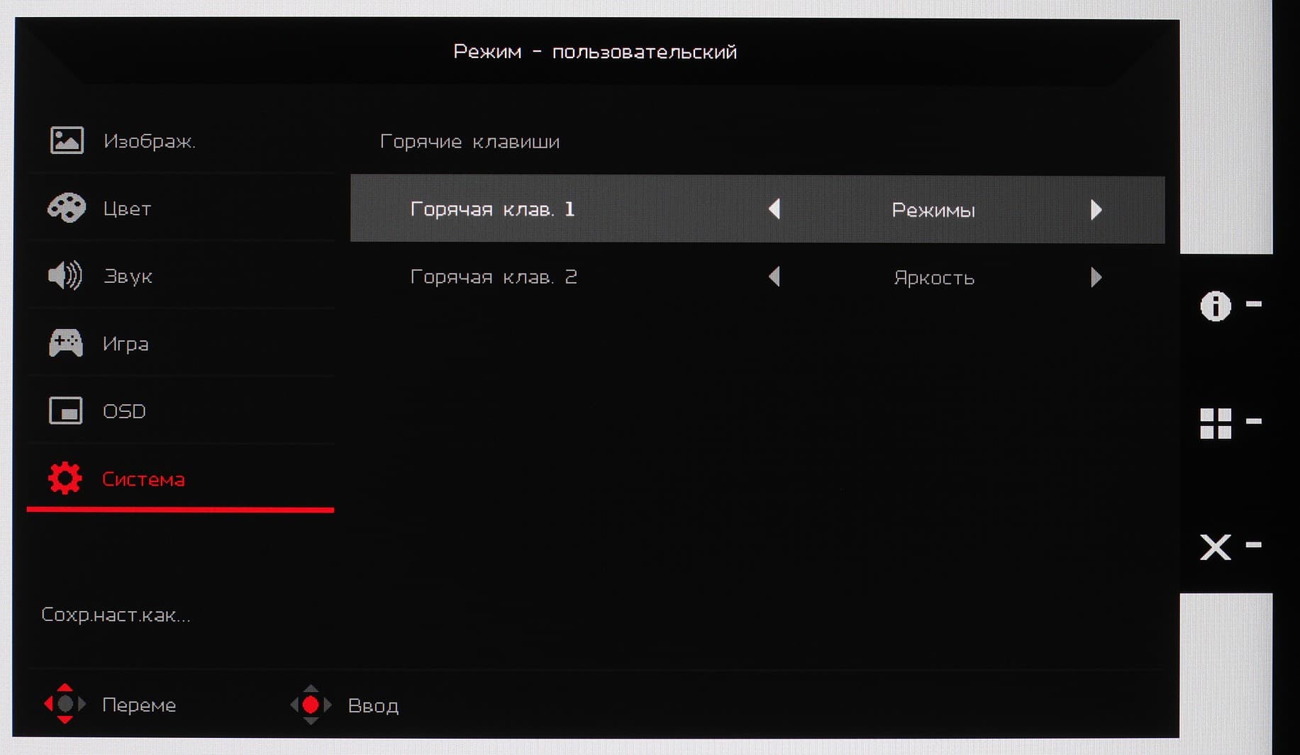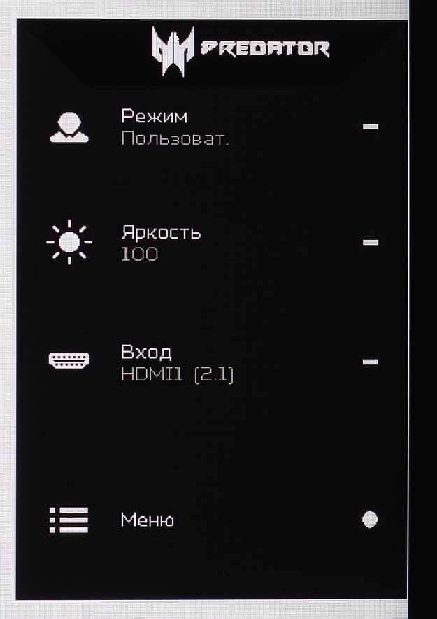 Индикатор питания при работе неярко светится синим, в режиме ожидания — оранжевым и не горит, если монитор условно выключен. Когда монитор включен и на экране нет меню, то при первом нажатии на кнопки (кроме кнопки питания) или нажатии, или отклонении джойстика на экран выводится стартовое меню из четырех пунктов.