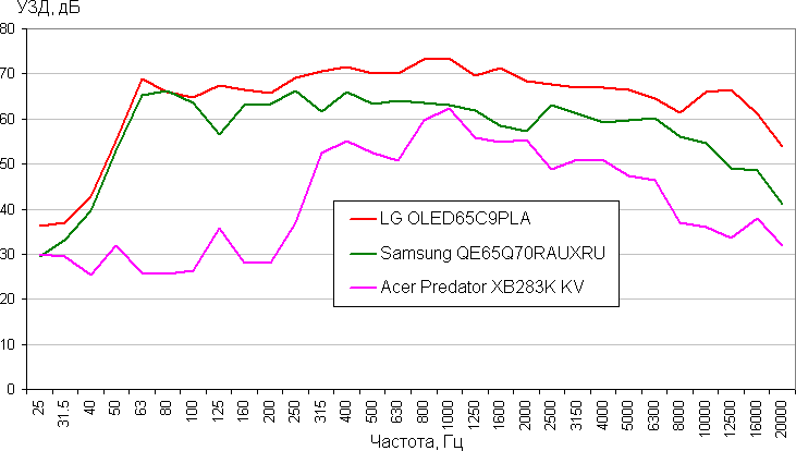 Качество встроенных громкоговорителей невысокое. Для сидящего перед монитором пользователя их громкость достаточная, низких частот нет совсем, есть выраженный «пластиковый» призвук из-за резонансов корпуса, стереофонический эффект расслышать можно. Сравним АЧХ этого монитора с АЧХ двух телевизоров высшего класса (воспроизводился розовый шум, уровни звукового давления в 1/3 октавах записывал шумомер Октава-111):
