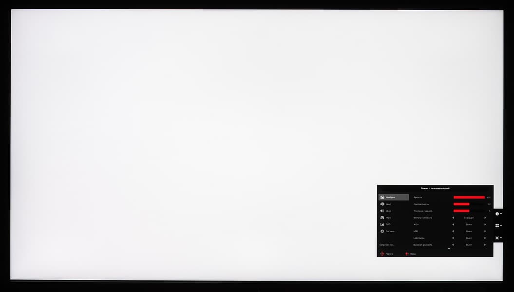 Равномерность белого очень хорошая, а черного, и как следствие, контрастности — заметно хуже. Контрастность для данного типа матриц по современным меркам типичная. Визуально видно, что черное поле местами в основном ближе к краям немного засвечено. Фотография ниже это демонстрирует: