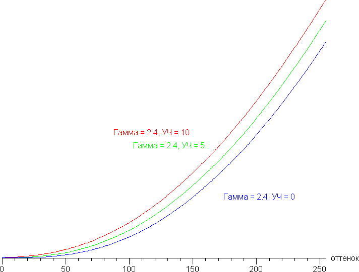 Дополнительной настройкой Усиление черного (от 0 до 10, по умолчанию 5, на графиках — УЧ) можно скорректировать гамма-кривую для улучшения/ухудшения различимости деталей в тенях: