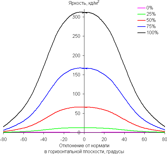 В качестве реперной точки можно выбрать отклонение в 45°, что может быть актуальным в случае, например, если изображение на экране рассматривают два человека одновременно. Критерием сохранения правильности цветов можно считать значение ΔE меньше 3. Стабильность цветов очень хорошая, это является одним из главных достоинств матрицы типа IPS.